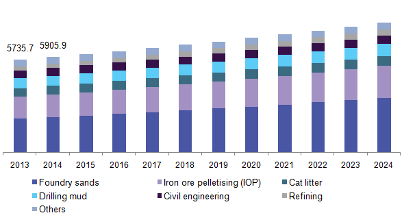钻井泥浆是最大的应用领域。然而,由于该产品在铸造砂和铁矿石球团等其他应用领域的应用范围不断扩大,预计在未来8年将失去市场份额。在预测期内,钢铁生产中铁矿石球团使用量的增加预计将对产品市场产生积极影响。
