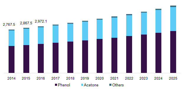 由于苯酚和丙酮的需求增加,全球市场的产量也在增加。苯酚成为最大的应用领域,占2016年总市场收入的61.4%以上。