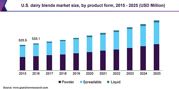 粉状乳制品混合物是最受欢迎的乳制品混合物。该部分占2018年总收入的50.0%以上。这种粉末主要用于制造婴儿食品或婴儿配方。它还可以作为冰淇淋和酸奶的甜味剂和稳定剂。此外,由于其干燥的形式,它易于储存并具有较长的保质期。由于这种奶粉通常是由喷雾干燥的牛奶制成的,所以它含有普通牛奶的所有营养价值。预计这些因素将推动该细分市场的发展。