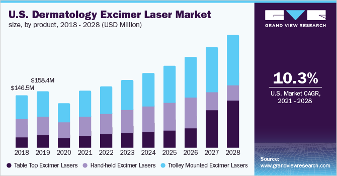 2020年,全球皮肤准分子激光市场规模为3.905亿美元,预计2021年至乐鱼体育手机网站入口2028年将以10.0%的复合年增长率(CAGR)增长。准分子308 nm激光是一种提供特定波长的紫外线B (UVB)辐射的靶向光疗形式。这些激光将UVB光输送到受影响的皮肤区域,同时不影响健康的皮肤组织。准分子激光器是高度可定制的,并且有不同的机头,使供应商能够管理每个病人所需的特定水平的紫外线波长。这些激光已被证明对治疗白癜风、牛皮癣、特应性皮炎等皮肤病有效,成功率高,复发率低。