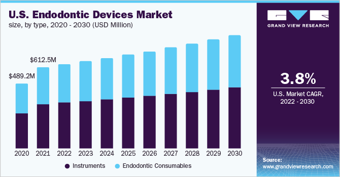 However, the total dental expenditures have declined from 4.5% to 3.7% from 2000 to 2020, and out-of-pocket dental expenditures have remained more than 40% of all dental care spending during this period. The market saw a slight setback due to the COVID-19 pandemic in the second and third quarters of 2020, particularly due to supply chain bottlenecks and national shutdowns. However, after the second quarter of 2020, dental procedures like root canalling, implants, etc. started to resume and this might boost the market growth. The endodontic consumables type segment in the U.S. market is expected to grow at a significant CAGR during the forecast period. A rise in the consumption of sugar and tobacco has led to an increased prevalence of tooth decay and infection.