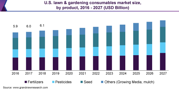 2019年,化肥和种子合计占总收入的60%以上。与其他草坪和园艺消耗品相比,这些产品形成了基本需求。除了设置草坪和花园作为家庭装饰的一部分外,它们还在农村和城市地区以小规模自给农业系统为主。