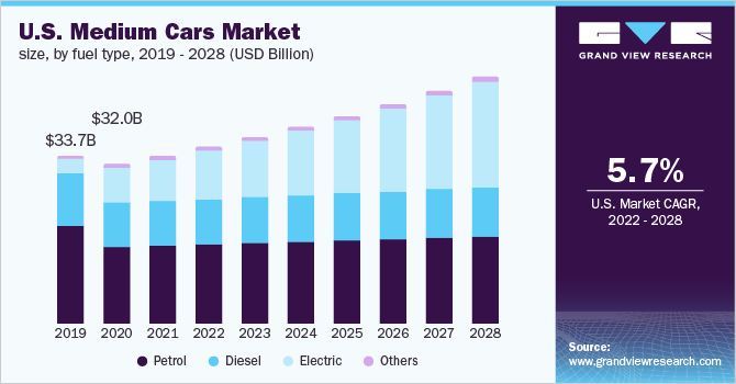 b。从2022年到2028年,全球中型车市场预计将以6.4%的复合年增长率增长,到2028年将达到3631亿美元。